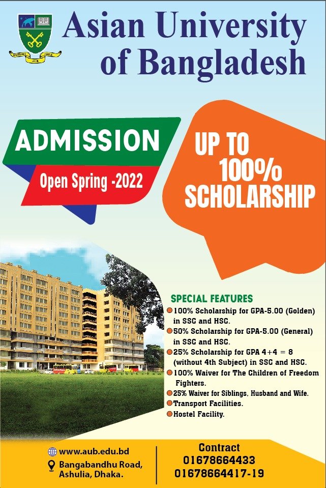 Asian University of Bangladesh | Admission Up to 100% Scholarship Mahmud August 24, 2022 Admission News 0 Comments Asian University of Bangladesh | Admission Up to 100% Scholarship AM-21K 611 Share this post Facebook Twitter LinkedIn Post navigation Previous Postবাউবির বিএসসিএজি প্রোগ্রামের ভর্তি কার্যক্রম সাময়িক স্থগিতNext PostGrand Mostafa Hotel Ababil Up To 40% Discount Leave a Comment Cancel reply Your Name Your Email Save my name, email, and website in this browser for the next time I comment. Your Comment Recent News Articles Fresh job related news content posted each day. October 14, 2025 Admission News 0 Comments Dhaka University Admission Open Announcement 2025 SL 66K474 Dhaka University Admission Open News 2025 Dhaka University Admission full description: ... Read More October 13, 2025 Admission News 0 Comments Dhaka University Admission Open Announcement 2025 SL 66K465 Dhaka University Admission Open News 2025 Dhaka University Admission full description: ... Read More October 12, 2025 Admission News 0 Comments Khulna University Admission Announcement 2025 SL 66K451 Khulna University Admission Notice 2025 Khulna University Admission Admission full description: ... Read More