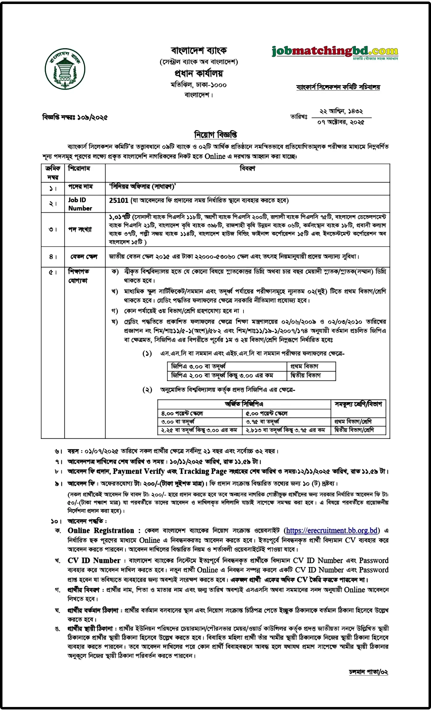 বাংলাদেশ ব্যাংক এ শূন্য পদে নিয়োগ দেয়া হবে। বাংলাদেশ ব্যাংক Bangladesh Bank Job Circular 2025 (Bangladesh Bank Job Circular 2025)১টি শূন্যপদে ১,০১৭জনকে স্থায়ীভিত্তিতে পদে নিয়োগ দেবে। পদগুলোতে নারী ও পুরুষ প্রার্থীরা আবেদন করতে পারবেন। আগ্রহী প্রার্থীরা অনলাইনে আবেদন করতে পারবেন। আগ্রহ ও যোগ্যতা থাকলে আপনিও আবেদন করতে পারেন। বিস্তারিত নিচে দেওয়া হল।