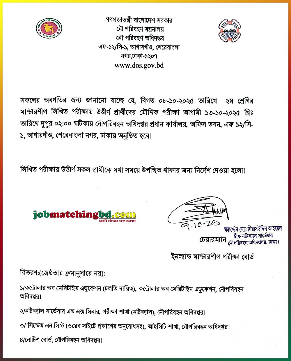 সকলের অবগতির জন্য জানানো যাচ্ছে যে, বিগত ০৮-১০-২০২৫ তারিখে ২য় শ্রেণির মাস্টারশীপ লিখিত পরীক্ষায় উত্তীর্ণ প্রার্থীদের মৌখিক পরীক্ষা আগামী ১৩-১০-২০২৫ খ্রিঃ তারিখে দুপুর ০২:০০ ঘটিকায় নৌপরিবহন অধিদপ্তর প্রধান কার্যালয়, অফিস ভবন, এফ ১২/সি-১, আগারগাঁও, শেরেবাংলা নগর, ঢাকায় অনুষ্ঠিত হবে।