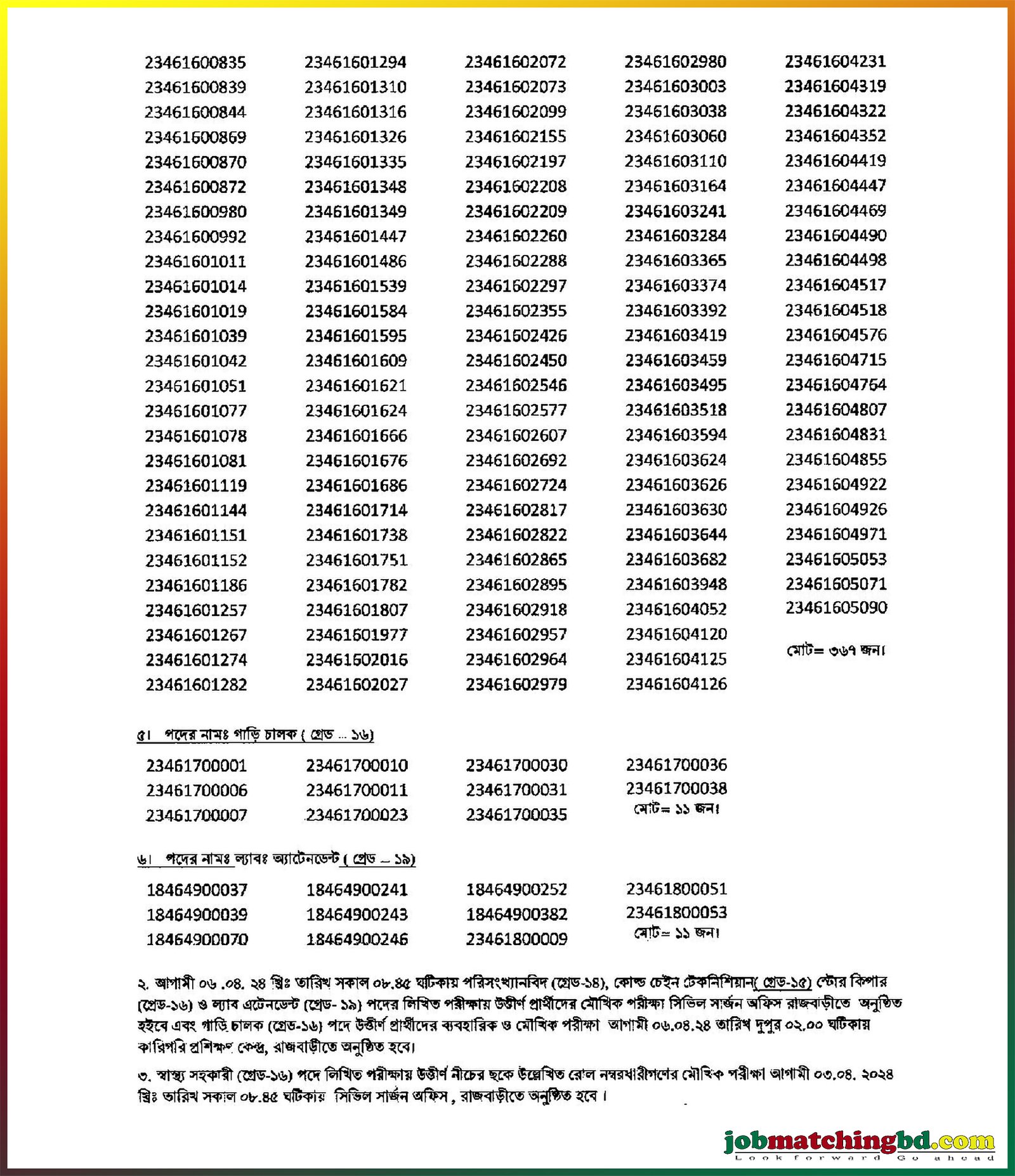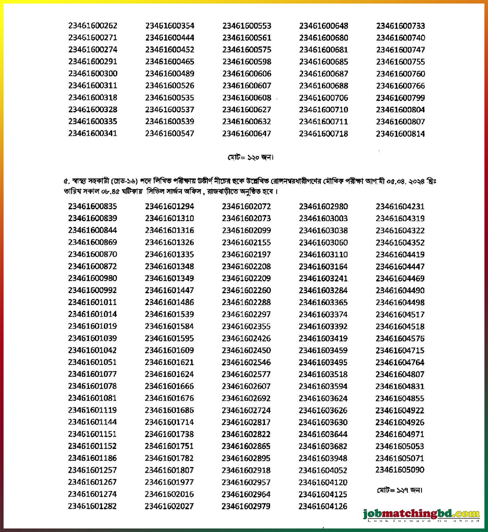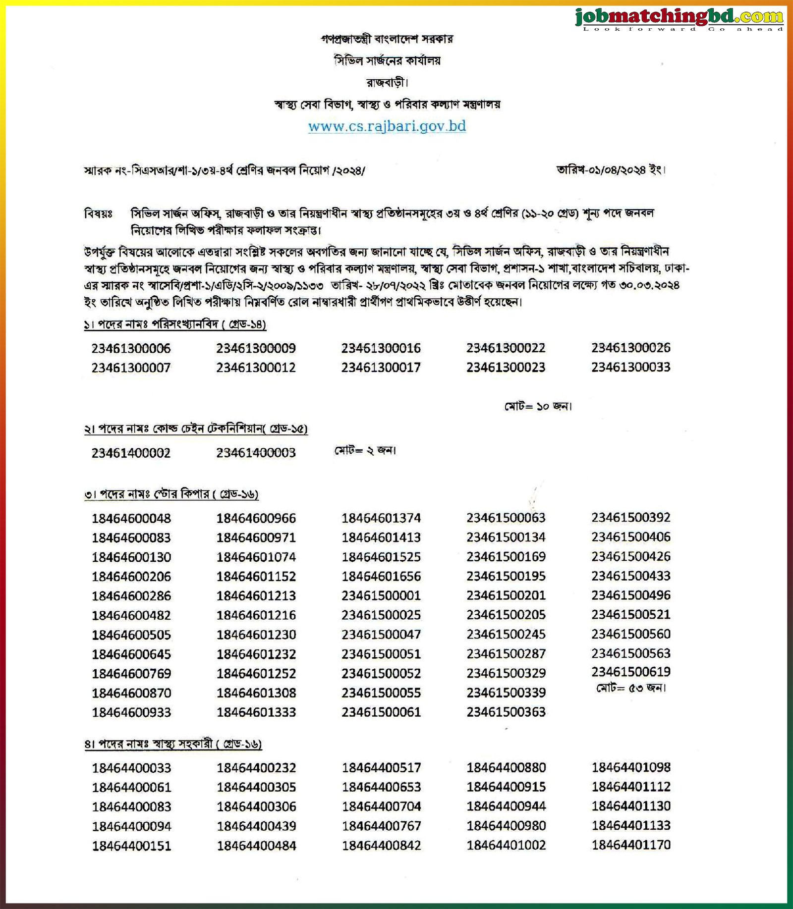 উপর্যুক্ত বিষয়ের আলোকে এতদ্বারা সংশ্লিষ্ট সকলের অবগতির জন্য জানানো যাচ্ছে যে, সিভিল সার্জন অফিস, রাজবাড়ী ও তার নিয়ন্ত্রণাধীন স্বাস্থ্য প্রতিষ্ঠানসমূহে জনবল নিয়োগের জন্য স্বাস্থ্য ও পরিবার কল্যাণ মন্ত্রণালয়, স্বাস্থ্য সেবা বিভাগ, প্রশাসন-১ শাখা, বাংলাদেশ সচিবালয়, ঢাকা- এর স্মারক নং স্বাসেবি/প্রশা-১/এডি/২সি-২/২০০৯/১১৩৩ তারিখ- ২৮/০৭/২০২২ খ্রিঃ মোতাবেক জনবল নিয়োগের লক্ষ্যে গত ৩০.০৩.২০২৪ ইং তারিখে অনুষ্ঠিত লিখিত পরীক্ষায় নিম্নবর্ণিত রোল নাম্বারধারী প্রার্থীগণ প্রাথমিকভাবে উত্তীর্ণ হয়েছেন।